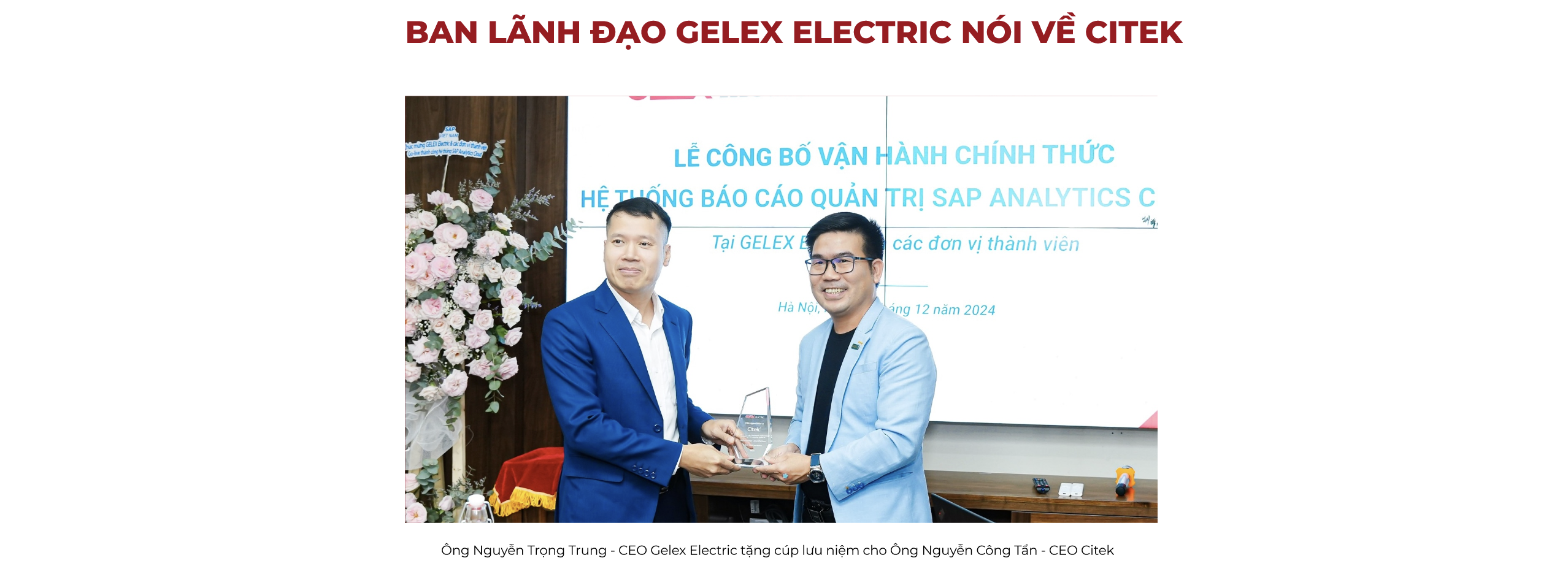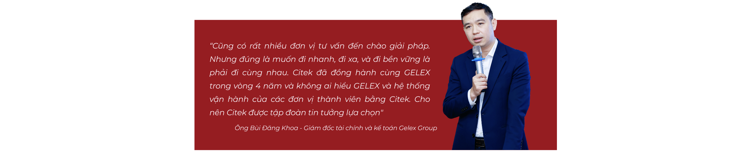 Tại buổi lễ, Ông Nguyễn Công Tẩn, Tổng Giám đốc Công ty Cổ phần Công nghệ Citek cho biết, GELEX Electric là một trong những khách hàng lớn đồng hành cùng Citek trong nhiều năm. Công ty chưa có một khách hàng nào đồng hành dài lâu như vậy, dài lâu cả về thời gian và khối lượng công việc. Với Citek, hệ thống GELEX là đơn vị đối tác, khách hàng lớn trong Top 3-5, nên tất cả thông tin, nguồn lực, chất lượng cũng như sự quan tâm được đầu tư cao nhất.